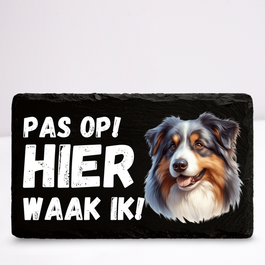 Pas op hier waak ik! Australische herder | Leistenen wandbordje