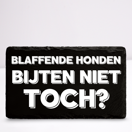 Blaffende honden bijten niet toch? | Leistenen wandbordje