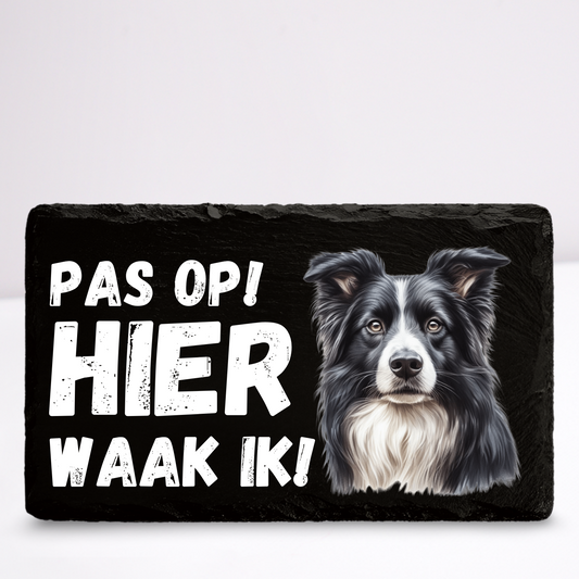 Pas op hier waak ik! Border collie | Leistenen wandbordje