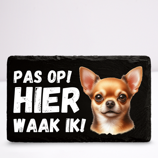 Pas op hier waak ik! Chihuahua (Bruin kortharig) | Leistenen wandbordje