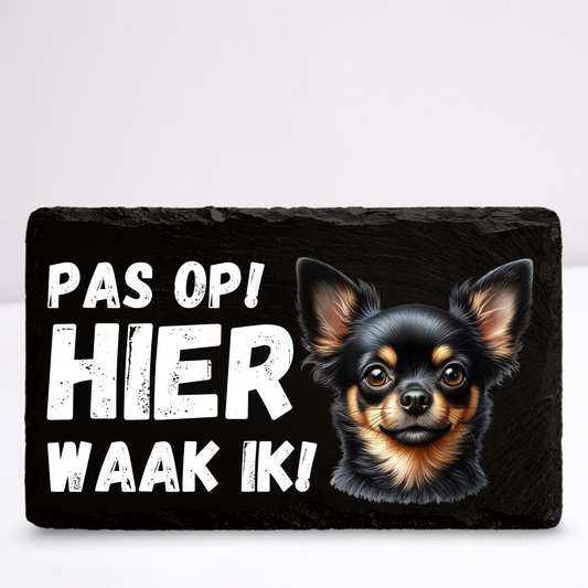 Pas op hier waak ik! Chihuahua (Zwart langharig) | Leistenen wandbordje