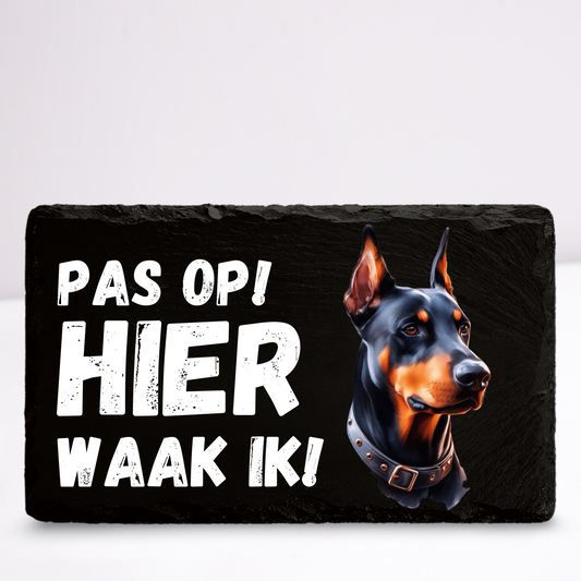 Pas op hier waak ik! Dobermann | Leistenen wandbordje