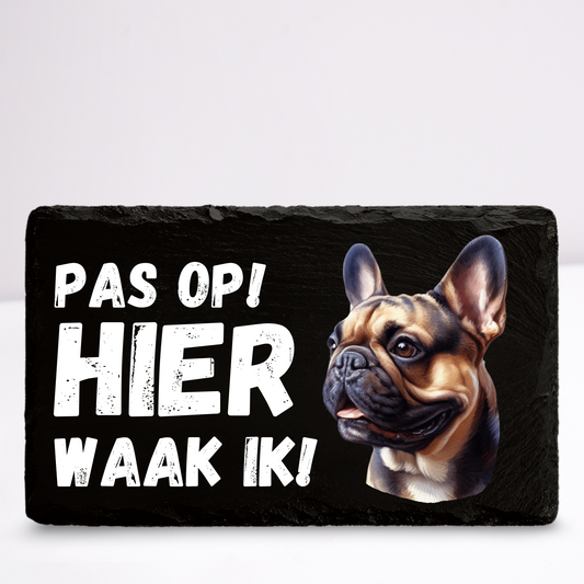 Pas op hier waak ik! Franse bulldog (Bruin) | Leistenen wandbordje