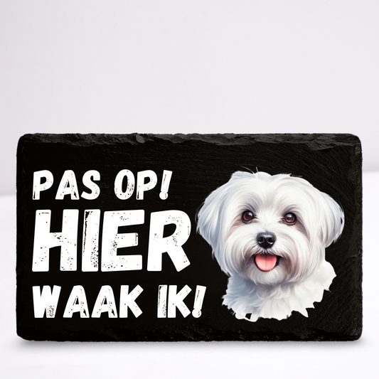 Pas op hier waak ik! Maltezer | Leistenen wandbordje