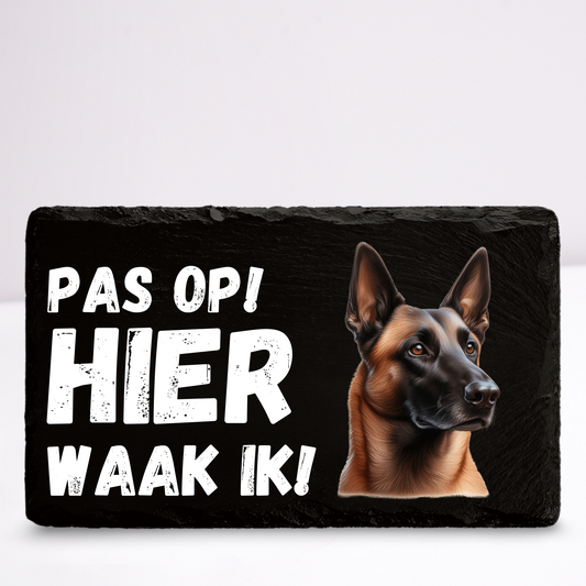 Pas op hier waak ik! Mechelse herder | Leistenen wandbordje