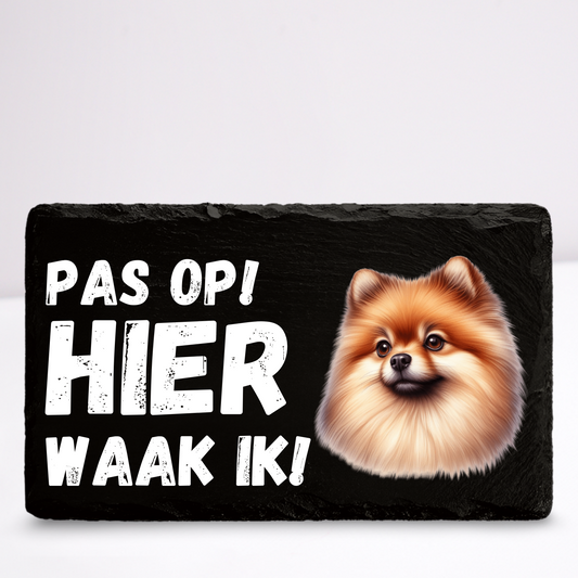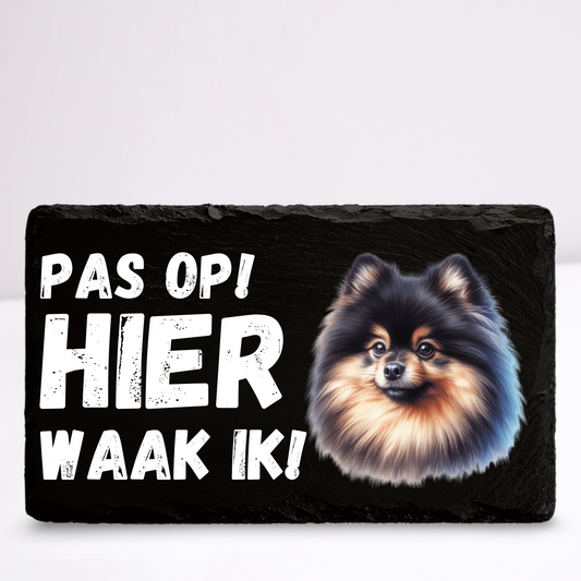 Pas op hier waak ik! Pomeriaan (Zwart) | Leistenen wandbordje