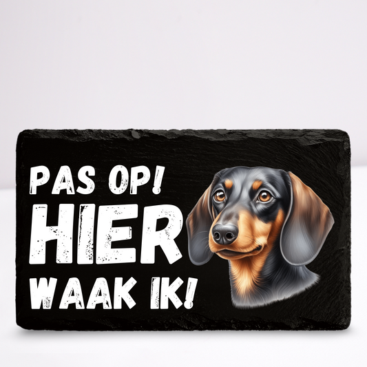 Pas op hier waak ik! Teckel | Leistenen wandbordje