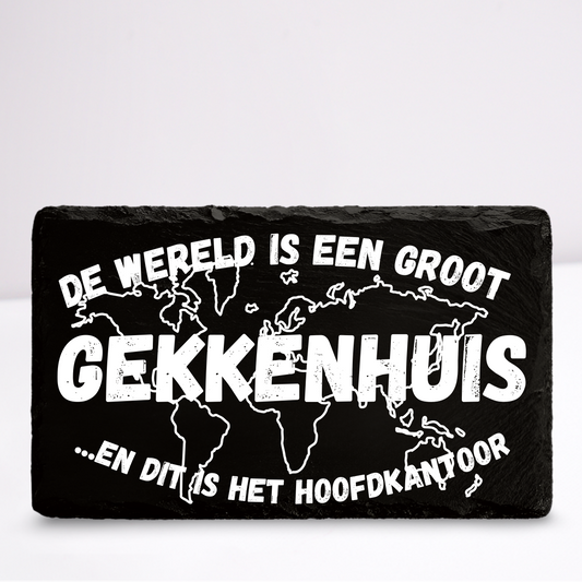 De wereld is een groot gekkenhuis | Leistenen wandbordje