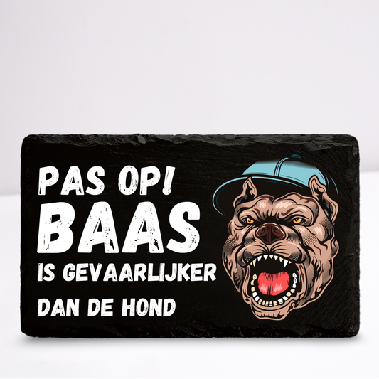 Pas op baas is gevaarlijker dan de hond | Leistenen wandbordje