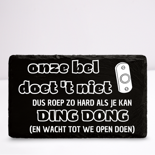 Onze bel doet 't niet | Leistenen wandbordje